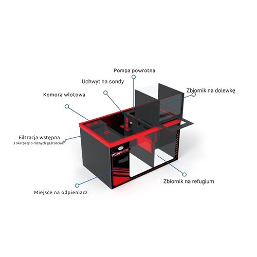 W zestawie znajduje się duży sump o przemyślanym układzie, który gwarantuje efektywną filtrację mechaniczną, chemiczną i biologiczną. Trzy niezależne rury w kominie zapewniają cichą i stabilną pracę układu przelewowego. Taki system doskonale radzi sobie z dużą biomasą i zapewnia wysoką jakość wody nawet przy intensywnie obsadzonym akwarium.