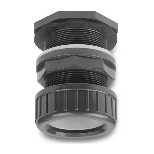 Szczelny przelot umożliwiający połączenie instalacji PCV z otworem w ścianie zbiornika. Dzięki nakrętce możliwy jest wielokrotny montaż i demontaż.Przelot ten posiada certyfikat odporności na działanie wody morskiej. Wymagana średnica otworu w szkle 43-50mm.