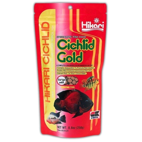 Cichlid gold to pokarm zawierający specjalne składniki pomagające w uzyskaniu naturalnego piękna ubarwienia i kształtów. Kompletny pokarm dla mniejszych pielęgnic i większych ryb tropikalnych potrzebujących wysokiego poziomu protein. Jest to pokarm zapewniający Twoim rybom wszystkie składniki odżywcze, które pomogą im zachować zdrowie, jednocześnie dzięki dużej zawartości karotenu i kiełków pszenicy wzmacniający ich kolory. Pokarm pływa po powierzchni i nie powoduje mętnienia wody.