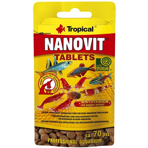 Tabletki Nanovit Tablets mogą być używane zarówno jako tonące, jak i samoprzylepne. Ze względu na swój rozmiar polecane są szczególnie dla niewielkich gatunków ryb wszystkożernych i mięsożernych oraz dla skorupiaków i ślimaków w nanoakwariach. Nie obciążają zbiornika nadmierną ilością substancji organicznych, co ułatwia utrzymanie czystości w nanoakwarium, a tym samym ogranicza rozwój glonów. Barwy ryb intensyfikują: naturalna astaksantyna, beta-karoten i ekstrakt z czerwonej papryki, które ponadto wpływają korzystnie na wiele procesów fizjologicznych, m.in. wzrost i rozmnażanie. Obecne w pokarmie mięczaki i skorupiaki, w tym smakowite kalmary, są źródłem bardzo dobrze przyswajalnego białka. Naturalny immunostymulator – beta-glukan – oraz substancje aktywne spiruliny wzmacniają układ odpornościowy ryb i skorupiaków.