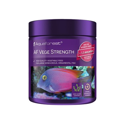 Wysoko przyswajalna roślinna karma dla dużych, ozdobnych ryb roślinożernych, m.in.: pokolców. Wysoka zawartość błonnika reguluje pracę przewodu pokarmowego, chroniąc jelita ryb roślinożernych przed stanami zapalnymi. AF Vege Strength dzięki zawartości spiruliny wzmacnia wybarwienie ryb. Zaleca się karmić małymi porcjami kilka razy dziennie.