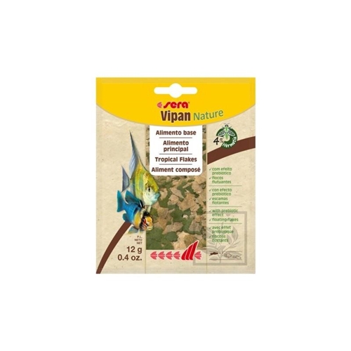 Sera Vipan Nature to pokarm podstawowy składający się z pływających płatków dla wszystkich ryb ozdobnych pobierających pokarm z powierzchni wody, który nie zawiera barwników ani konserwantów.