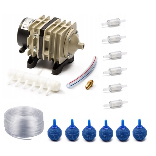 Elektromagnetyczne pompy powietrza z serii ACO to kompresory tłokowe gdzie ruch tłoka powodowany jest zmiennym polem elektromagnetycznym. Nie należą do najbardziej cichych pomp. Ale to właśnie one dzięki swojej niezawodności i możliwości pracy ciągłej, małemu zużyciu energii znalazły swoje zastosowanie w napowietrzaniu oczek wodnych, stawów, systemowych zbiorników do hodowli ryb akwariowych i w innych dużych gospodarstwach rybackich.