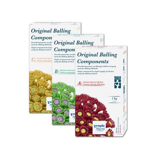 Tropic Marin® BIO-CALCIUM ORIGINAL BALLING salts to najczystrze jakościowo proszki do metody ballinga, dzięki, którym w łatwy sposób możemy uzupełniać braki wapnia i kH w akwarium morskim. Trzyczęściowy zestaw podzielony jest na dwuwodny chlorek wapnia (część A) i wodorowęglan sodu (część B), podczas gdy dodanie soli bez chlorku sodu(część C) utrzymuje równowagę jonową kluczową dla akwarium. Ten zbalansowany system dozowania wapnia tworzy najlepsze warunki dla dobrego wzrostu koralowców oraz alg wapiennych przy jednoczesnym uniknięciu niedoborów ważnych elementów, które można zaobserwować przy metodach dwu częściowych.