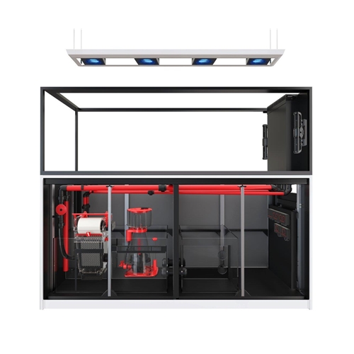 Komora filtracyjna z skarpetami pozwala i zapobiega zatykaniu się pompy. Komora jest łatwa w edycji i standardową skarpetę filtracyjną można zastąpić Red Sea ReefMat, który jeszcze dokładniej zadba o klarowność Twojej wody w zbiorniku. Woda po filtracji wstępnej jest transportowana do komory odpieniacza gdzie jest utrzymywany stały poziom wody tak aby praca odpieniacza była zawsze wykorzystana w stu procentach. Komora bubble stop pozwala na wyłapanie pojedynczych pęcherzyków powietrza. Tak przefiltrowana woda trafia do komory z pompą obiegową (nie załączona w zestawie) która ponownie wypompuje wodę do zbiornika głównego.