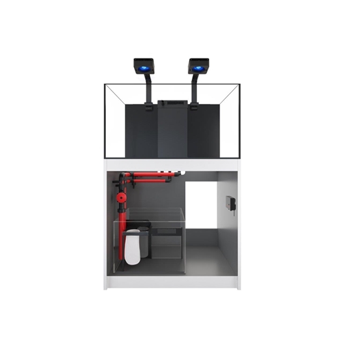 Komora filtracyjna z skarpetami pozwala i zapobiega zatykaniu się pompy. Komora jest łatwa w edycji i standardową skarpetę filtracyjną można zastąpić Red Sea ReefMat, który jeszcze dokładniej zadba o klarowność Twojej wody w zbiorniku. Woda po filtracji wstępnej jest transportowana do komory odpieniacza gdzie jest utrzymywany stały poziom wody tak aby praca odpieniacza była zawsze wykorzystana w stu procentach. Komora bubble stop pozwala na wyłapanie pojedynczych pęcherzyków powietrza. Tak przefiltrowana woda trafia do komory z pompą obiegową (nie załączona w zestawie) która ponownie wypompuje wodę do zbiornika głównego.