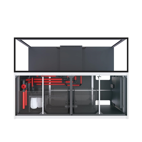 Komora filtracyjna z skarpetami pozwala i zapobiega zatykaniu się pompy. Komora jest łatwa w edycji i standardową skarpetę filtracyjną można zastąpić Red Sea ReefMat, który jeszcze dokładniej zadba o klarowność Twojej wody w zbiorniku. Woda po filtracji wstępnej jest transportowana do komory odpieniacza gdzie jest utrzymywany stały poziom wody tak aby praca odpieniacza była zawsze wykorzystana w stu procentach. Komora bubble stop pozwala na wyłapanie pojedynczych pęcherzyków powietrza. Tak przefiltrowana woda trafia do komory z pompą obiegową (nie załączona w zestawie) która ponownie wypompuje wodę do zbiornika głównego.