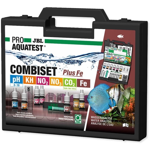 JBL ProAquatest CombiSet Plus Fe to walizka z testami do sprawdzenia sześciu ważnych parametrów wody w akwariach słodkowodnych. W zestawie znajduje się także test na żelazo, pierwiastek bardzo istotny dla roślin. Dzięki testom JBL można szybko i niezawodnie kontrolować parametry wody w akwarium.
