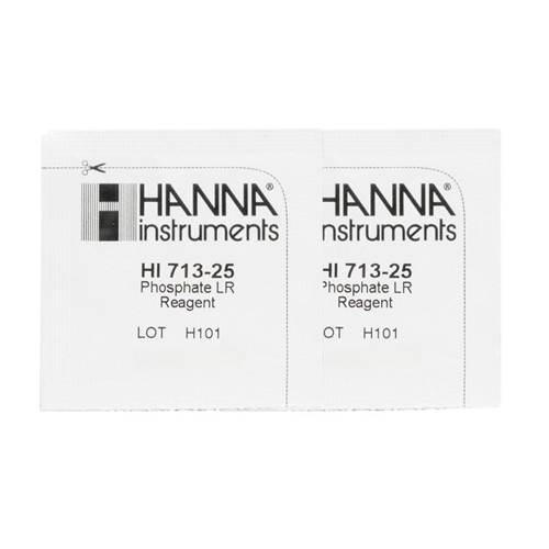 Reagenty do mini fotometru hanna 713. Opakowanie zawiera 25 sztuk saszetek / reagentów do elektronicznego testera ilości fosforanów w akwarium hanna HI 713. Zakres pomiaru fosforanów od 0,00 do 2,50 mg/l (ppm)